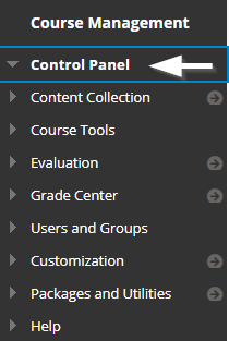 Below the Course Menu is the Control Panel. This is where you'll find Instructor Tools such as the Grade Center, Test Manager, Course Copy, etc. Click on a category to expand it and find links to access specific components which will display in the Main Content Frame.