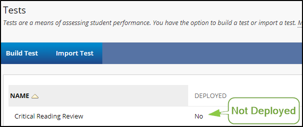 Tests are created or imported to the "Test Manager" which is located in the Control Panel under Course Tools — Tests, Surveys and Pools. For students to have access, they must be "deployed" in a content area or folder. When they are deployed, a column is automatically created in the Grade Center. Test options may be set to limit availability, add passwords, set time limits, determine level of feedback, etc.