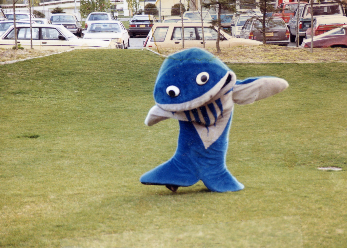 Our school mascot has always been a Humpback Whale (est. 1987) but the mascot character itself has not. The original Spike costume was actually a modified catfish made to look more like a Humpback Whale. The current Spike is custom designed, complete with Southeast Sneakers (rain boots).